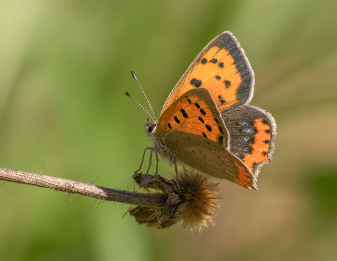 Bei der Biotoppflege am 6.9.2025 auf der Bachwiese gelangen Erika Post diese schönen Bilder der Gartenkreuzspinne (unten) und des Kleinen Feuerfalters (oben).