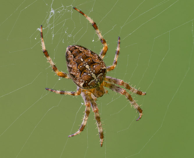 An ihrem schön gezeichneten Unterleib kann man die Spinnwarzen erkennen, auf der Oberseite sieht man die charakteristischen weißen Flecken.
